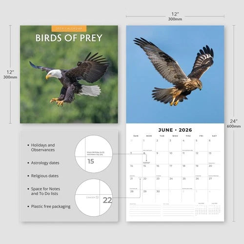 Der Birds of Prey Calendar 2026 von Red Robin ist ein 12-monatiger Wandkalender mit 4 zusätzlichen Bonusmonaten (September bis Dezember 2025). Der Kalender zeigt eine Reihe sorgfältig ausgewählter Fotografien von Raubvögeln und wurde mit einem Auge für Nachhaltigkeit und einen verantwortungsvollen Umgang mit Materialien produziert.