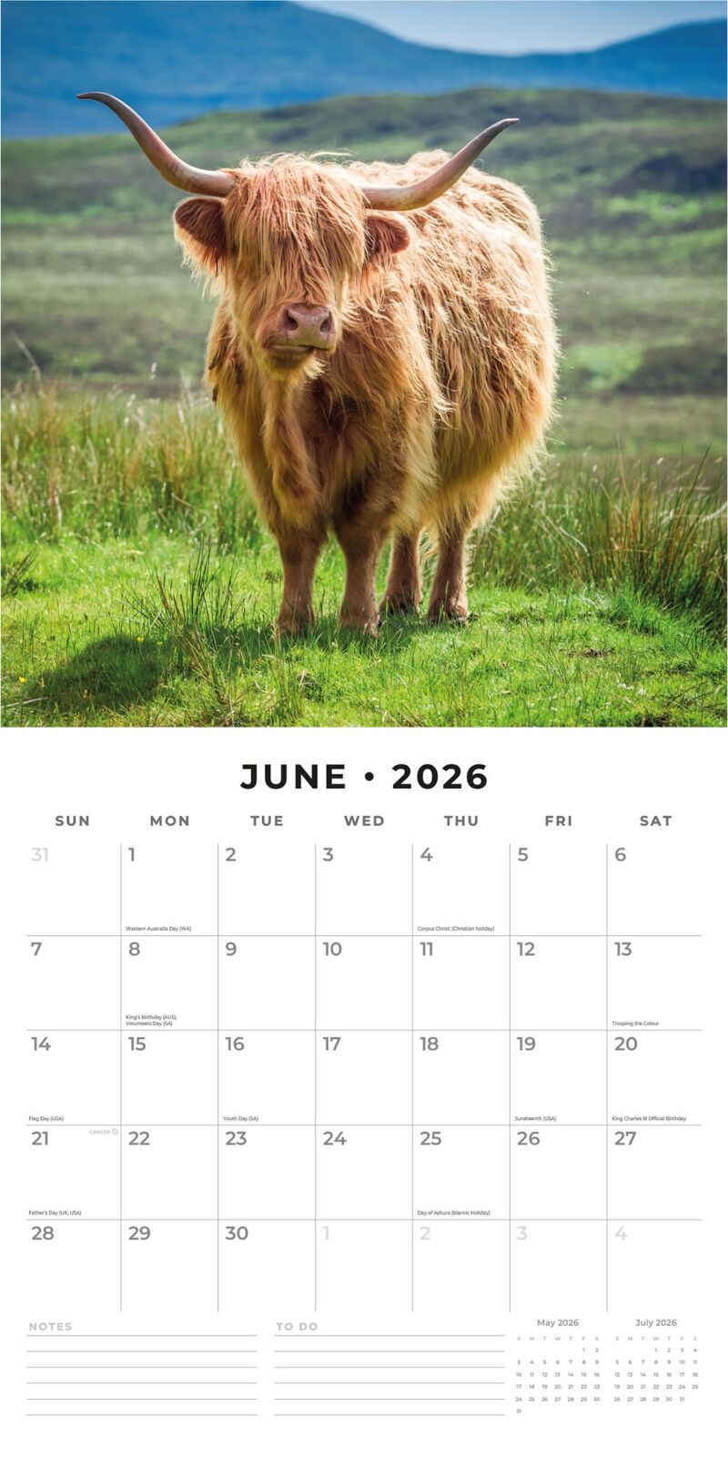 Der Scottish Highlander Kalender 2026 Red Robin ist aus Hochglanzpapier und beginnt im September 2025 und hat ein großes Foto des Scottish Highlanders von Januar 2026 bis Dezember 2026 darunter mit den verfügbaren Daten des Monats mit Platz für persönliche Notizen und Geburtstage. Einige wichtige Feiertage sind bereits in den Kalender eingetragen worden. Die Texte auf dem Scottish Highlander 16-Monatskalender von Red Robin sind auf Englisch gedruckt. Aufgeklappt misst der Kalender ca. 30 x 60 cm mit dem Bild oben und den Daten des Monats unten.