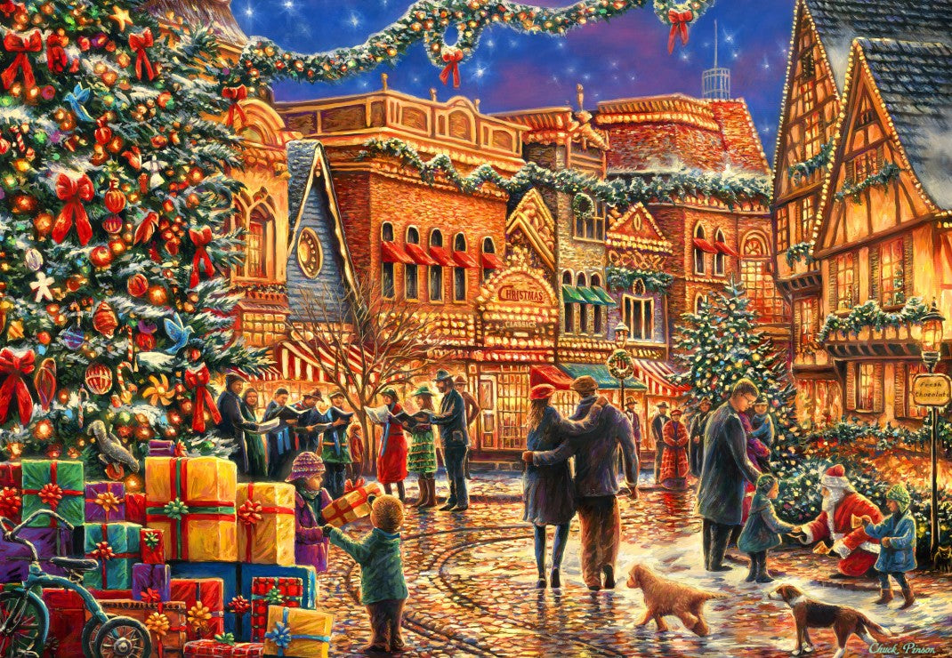 Breng de warmte van de feestdagen in huis met de Christmas at the Town Square puzzel. Een sfeervol dorpsplein komt tot leven: historische gevels zijn feestelijk versierd met lichtjes en kransen, sneeuw bedekt de klinkers en in het midden schittert een grote kerstboom. Rondom het plein wandelen mensen langs kraampjes en verlichte etalages – een levendig kersttafereel vol nostalgie en detail.