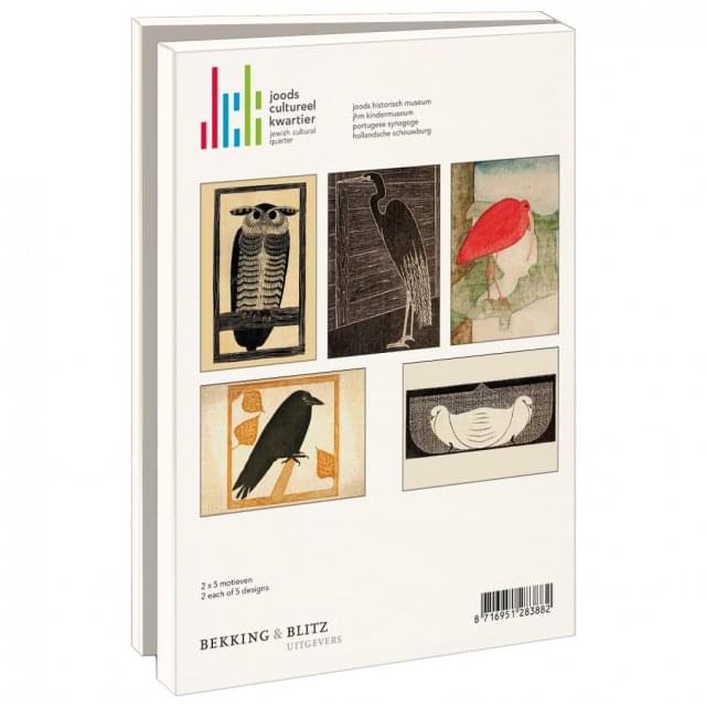 Samuel Jessurun de Mesquita was een invloedrijke Nederlandse graficus en docent, bekend om zijn expressieve lijnvoering en verfijnde composities. Zijn werk bestaat voornamelijk uit houtsneden en tekeningen, vaak met dieren, planten en portretten als onderwerp. De illustraties in dit kaartenmapje zijn afkomstig uit de collectie van het Joods Historisch Museum (JHM) en tonen zijn unieke en herkenbare stijl.