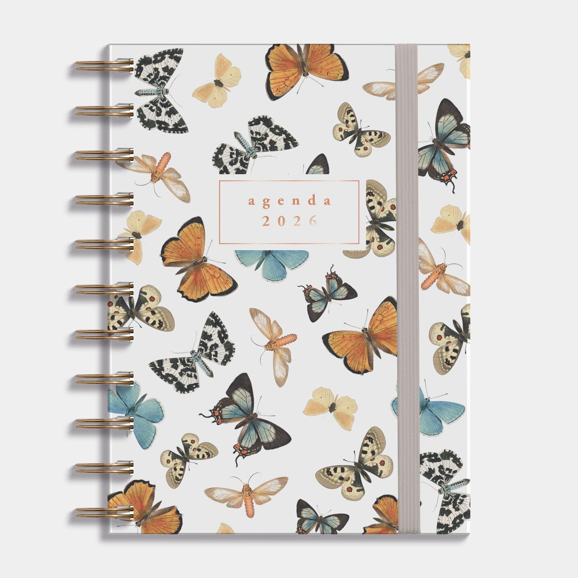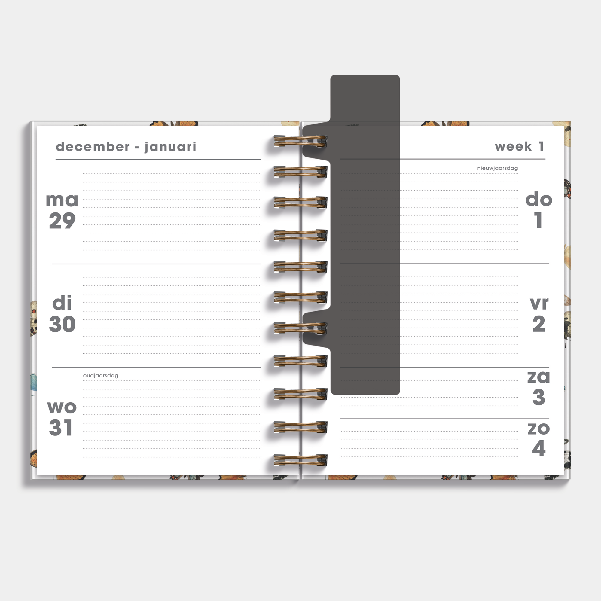 Ring binder diary with flexible cover with transparent insert sleeve. Inside the cover is a card with a cheerful print of small flowers in watercolor drawing style. The text on this card is printed in gold foil. The diary is held closed by an elastic band and has a movable bookmark to quickly get to the correct date. The format of the calendar is éé one week over two pages and has 5 transparent inserts with ten beautiful gift cards. This calendar runs from November 2025 to December 2026.