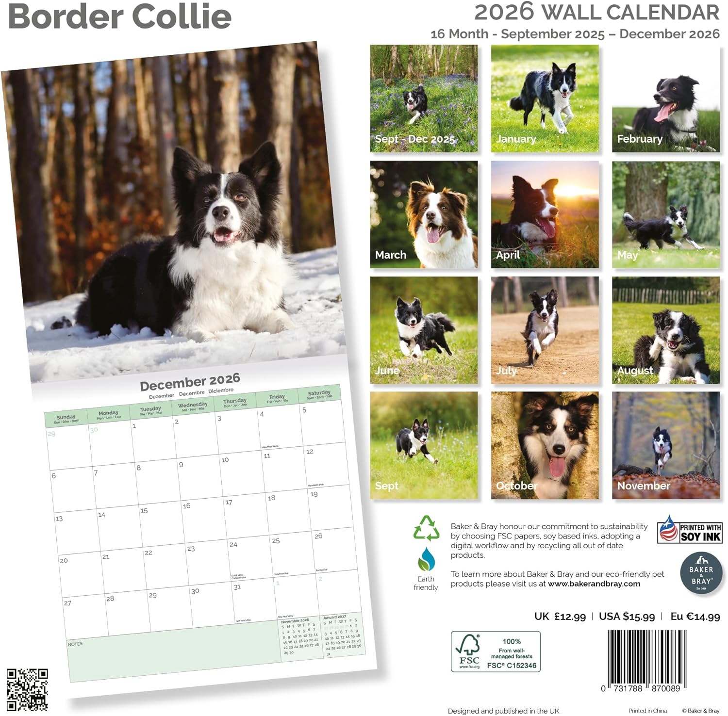 To a true Border Collie lover like you, a beautiful calendar like this one should definitely not be missing. The Border Collie calendar 2025 features 13 truly stunning plates of this beautiful dog, which is mostly praised for their excellent skills in herding any kind of livestock. The Border Collie belongs to the group of Sheepdogs and Cattle Drivers, its medium-sized and athletic build makes it a popular working dog , it is particularly impressive to anyone who meets it in its path. Some people after seeing this medium-sized dog, full of confidence and determination like the Border Collie want no other breed. Their hearts are stolen by this obedient and friendly family dog. Is that the case with you too? Then order your own Border Collie Calendar immediately and give it a beautiful place on the wall! The Calendar starts in September 2024 and has from January 2025 to December 2025 a large photo of the Border Collie with below it the available dates of the month with space for personal notes and birthdays. A number of important holidays have already been added to the calendar. The texts on the Border Collie 16 month calendar by Baker & Bray are printed in English. Unfolded, the calendar is approximately 30 x 60 cm with the image at the top and the dates of the month below. The calendar has a hole at the top so you can easily hang the calendar on a hook or nail. For example, in the kitchen, office or toilet.
