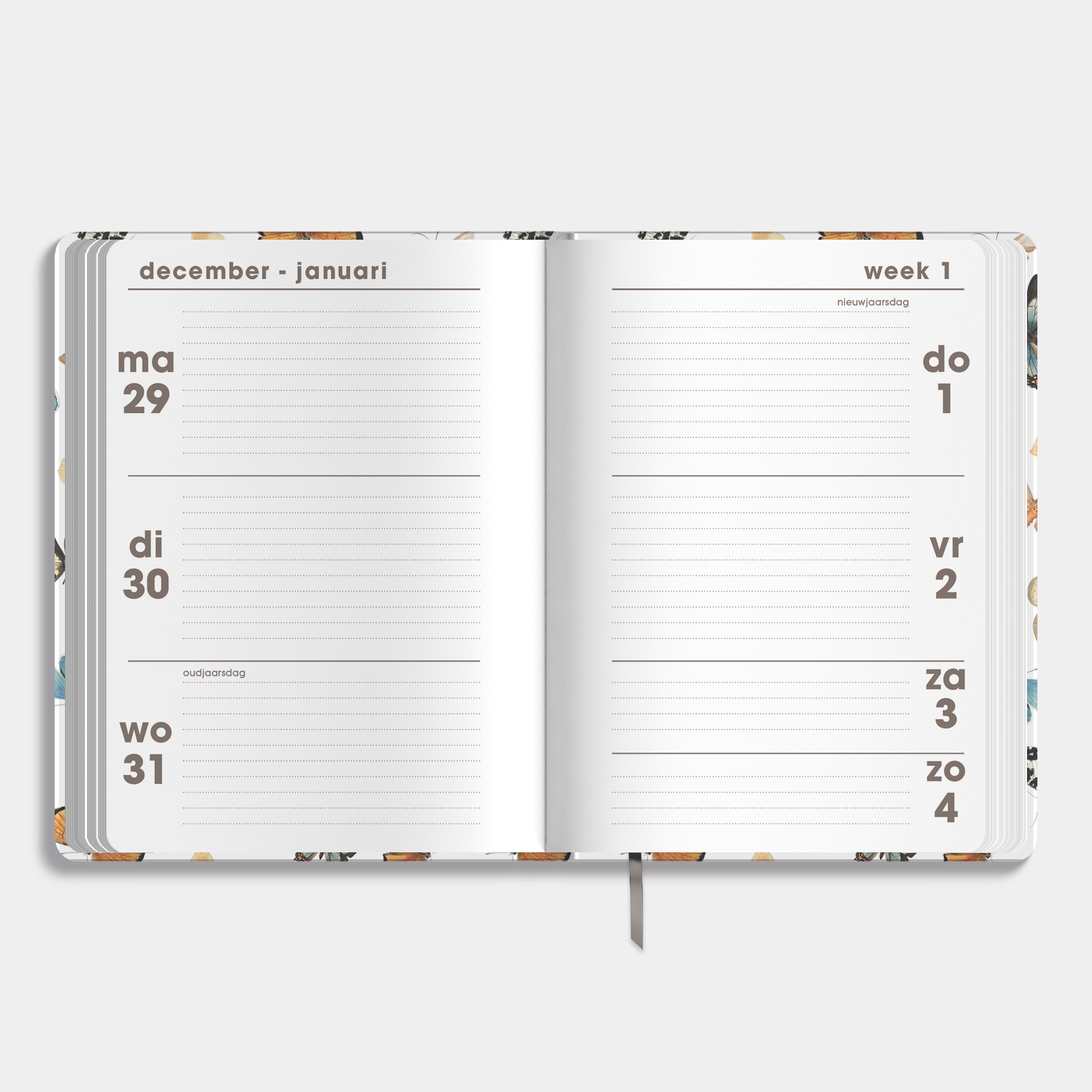 Beautiful diary with soft cover and rounded corners. The cover is designed with a pattern of butterflies. The diary is closed by a light gray elastic band. The reading ribbon is also not to be missed. The format of the diary is one week over two pages. This diary runs from November 2025 to December 2026.