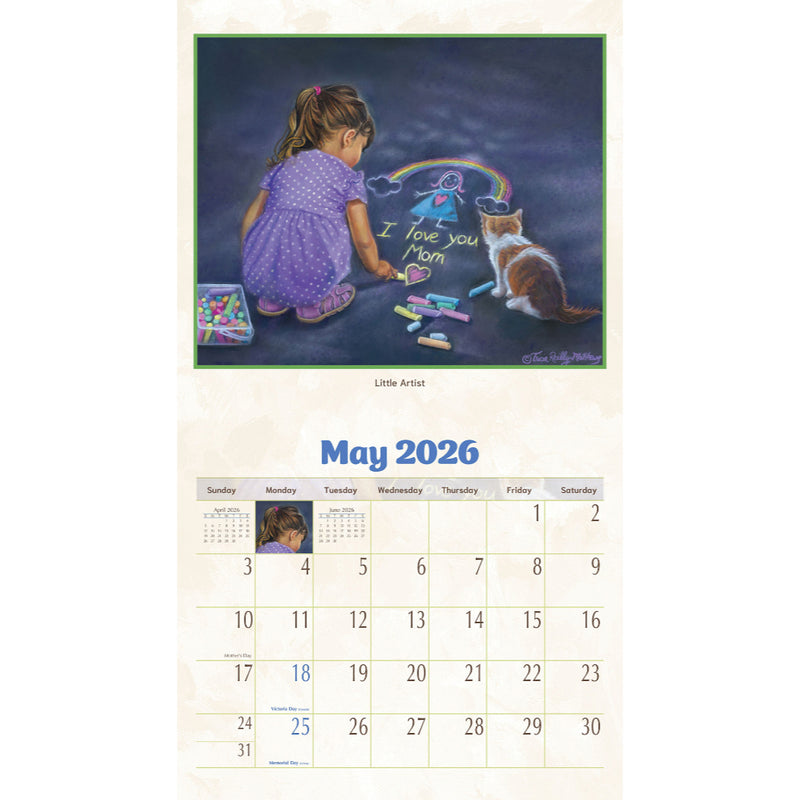 The Young at Heart Calendar 2026 Pine Ridge is printed on luxurious linen textured paper using original artwork by; Tricia Reilly-Matthews. The calendar starts in January 2026 and runs through December 2026. Each month features a large image of the Young at Heart with available dates for the month below with space for personal notes and birthdays. A number of important holidays have already been added to the calendar. The texts on the Young at Heart 12 month calendar from Pine Ridge are printed in English. Folded out, the calendar is approx. 34 x 61 cm with the image at the top and the dates of the month below.