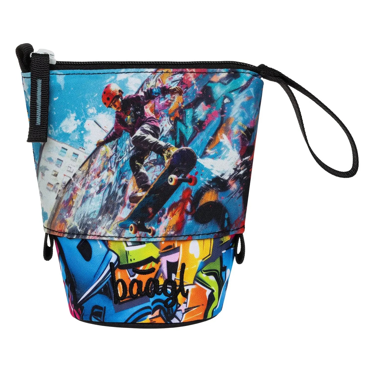 De Baagl Pop-up Etui Skatepark is een slim en veelzijdig etui met een cool skatepark design. Dankzij het innovatieve ontwerp verander je dit etui met één simpele beweging in een staande penhouder. Ideaal voor school, thuis of onderweg – perfect voor kinderen en skate-liefhebbers.