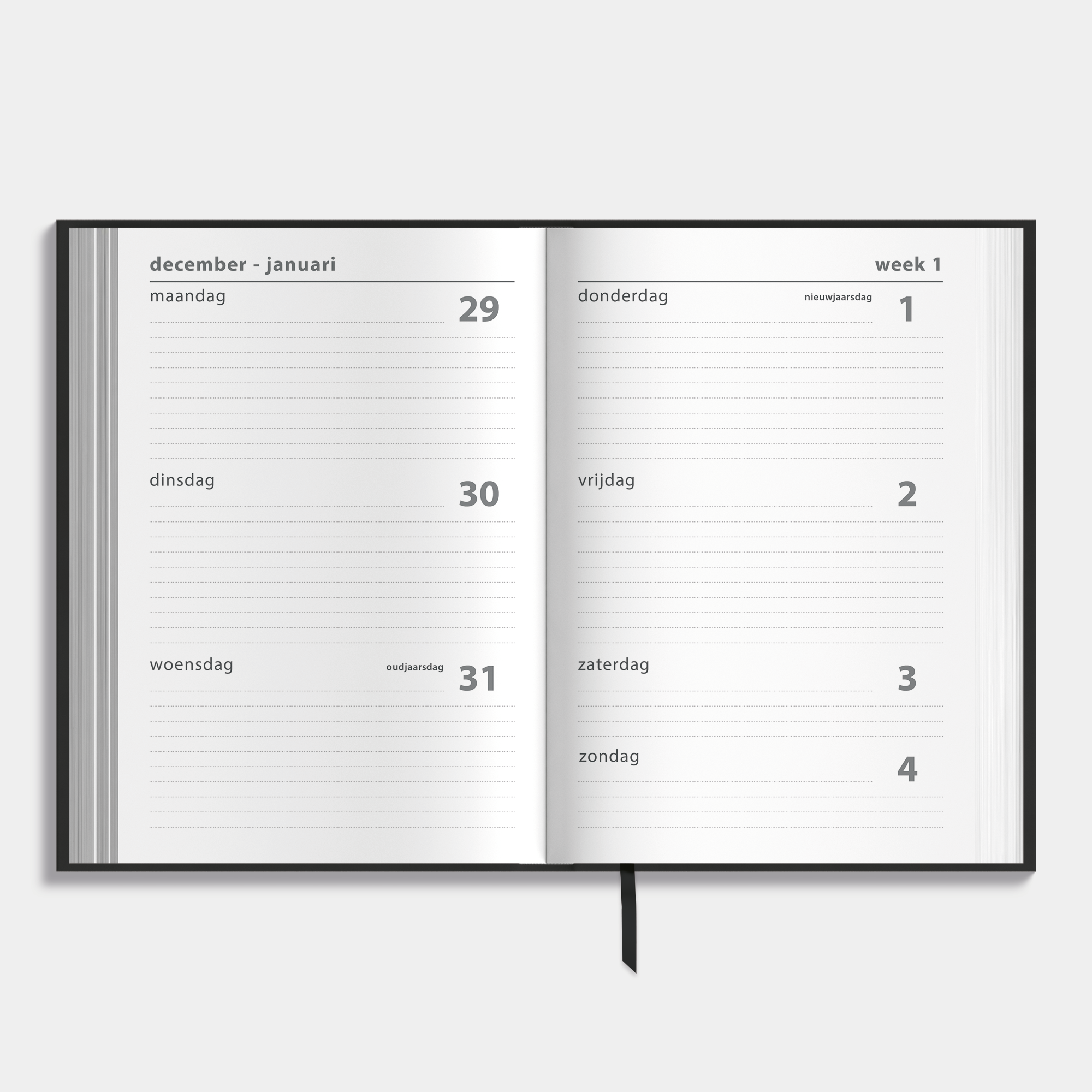 The basic diary with a hard cover, on the black cover the text is printed in silver foil. The diary is quiet in design and features a reading ribbon. The diary layout is éé one week over two pages. This diary runs from November 2025 to December 2026.