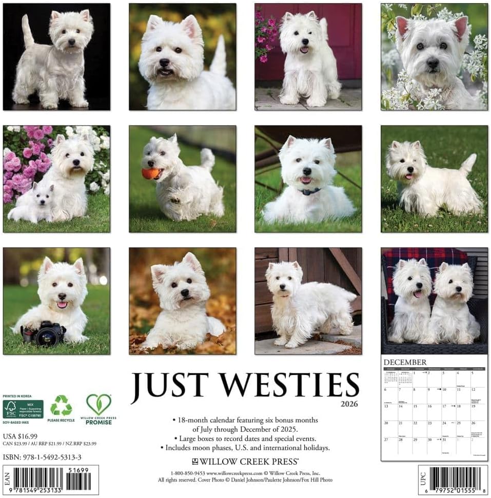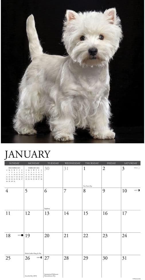 Para un verdadero amante del West Highland White Terrier como tú, no puede faltar un hermoso calendario como éste. El calendario 2026 del West Highland White Terrier presenta 13 imágenes realmente impresionantes de este hermoso perro. Muchos criadores y cazadores no solían querer utilizar los cachorros blancos de Cairn Terrier, pero algunos eran muy partidarios. Debido a esto último, se creó esta raza. El West Highland White Terrier pertenece al grupo de los Terrier. Su aspecto pequeño, compacto y luchador lo hace especialmente impresionante para cualquiera que se cruce en su camino. Algunas personas, después de ver al pequeño, juguetón e inteligente West Highland White Terrier, no quieren ninguna otra raza. Este perro alegre y cariñoso les roba el corazón. ¿A ti también te pasa? Entonces pide inmediatamente tu propio Calendario del West Highland White Terrier y dale un bonito lugar en la pared