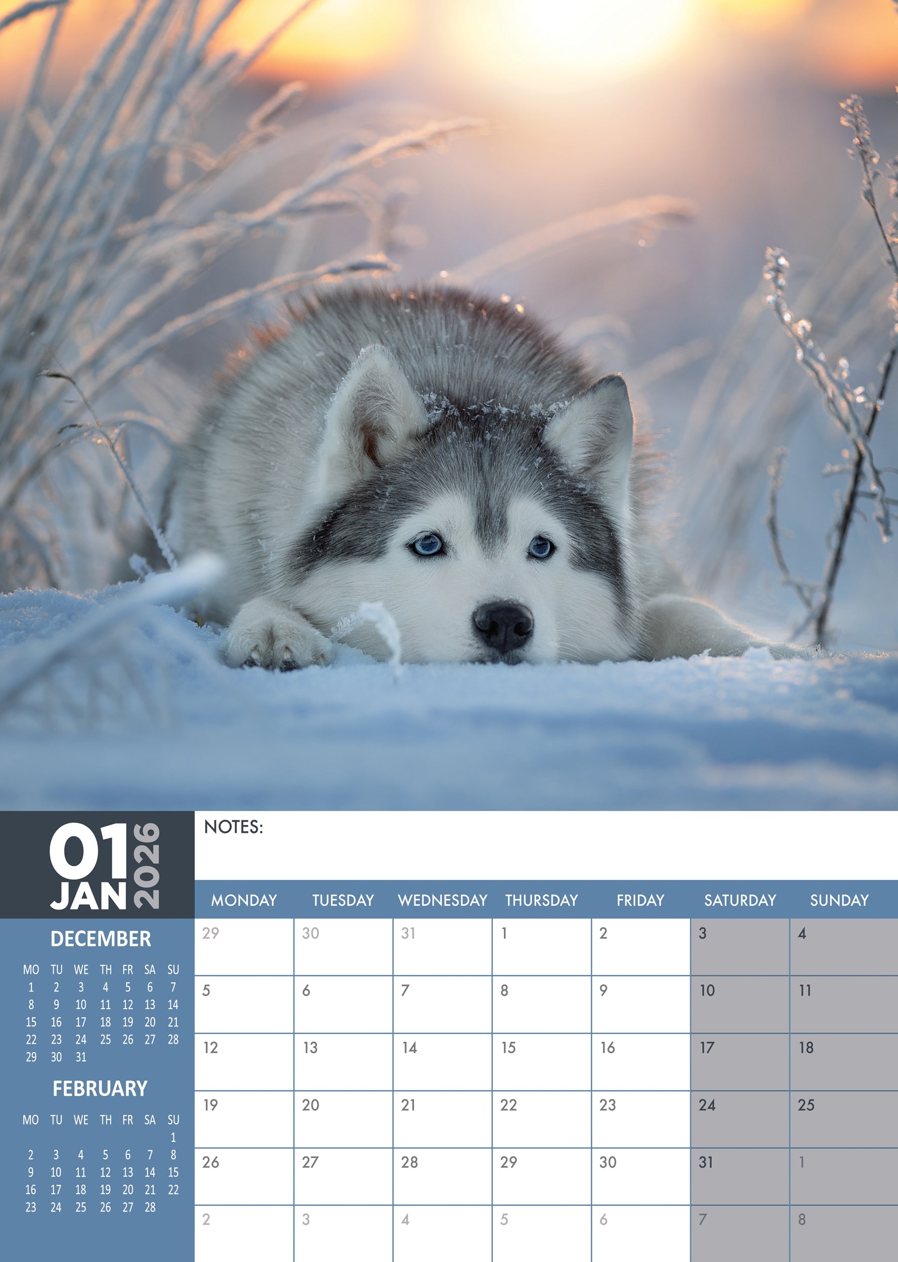 El calendario A3 del Husky siberiano para 2026 contiene un total de 12 imágenes diferentes a todo color, cada mes una nueva foto impresionante de esta querida raza canina. Imprescindible para los verdaderos amantes del Husky siberiano.