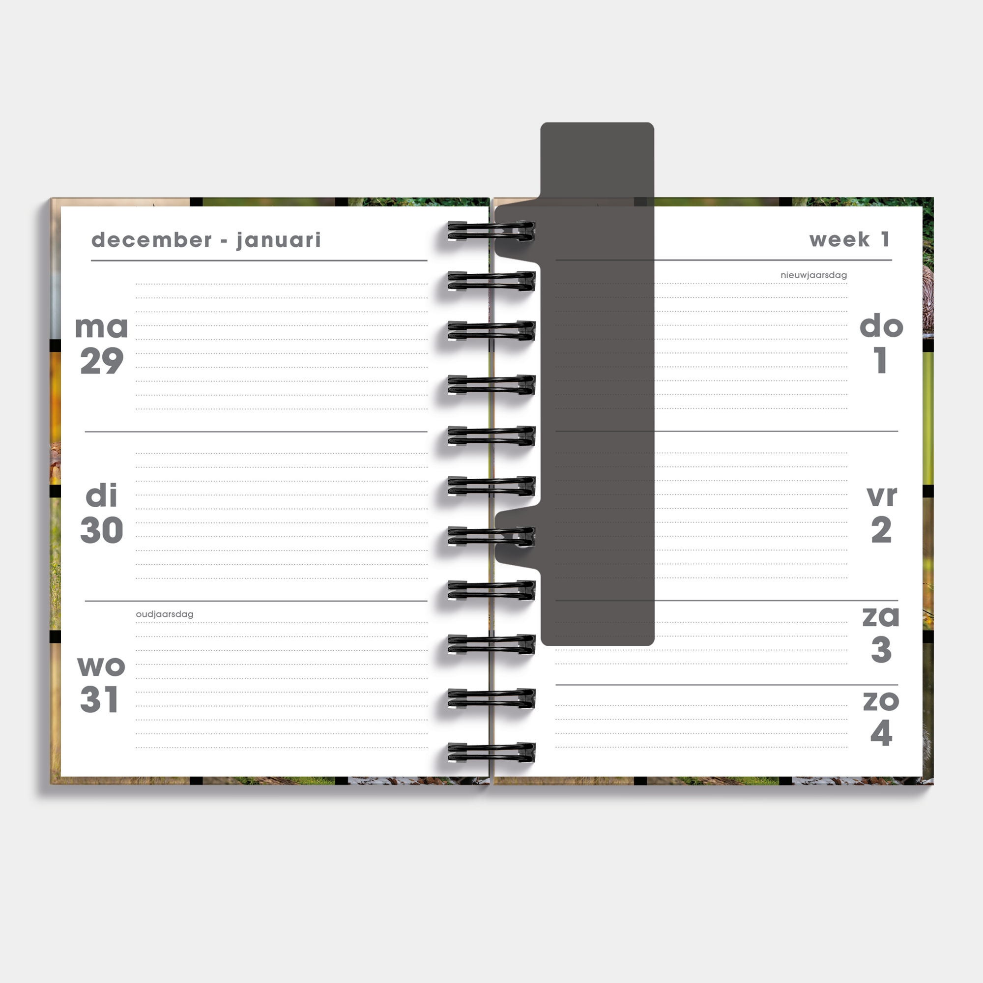 Agenda en espiral de tapa dura con fotos de la fauna de Holanda. La agenda se mantiene cerrada mediante una banda elástica y tiene un marcapáginas móvil para llegar rápidamente a la fecha correcta. El formato de la agenda es de una semana en dos páginas y tiene 5 encartes transparentes con diez bonitas tarjetas de regalo con animales salvajes de Holanda. Esta agenda va de noviembre de 2025 a diciembre de 2026.
