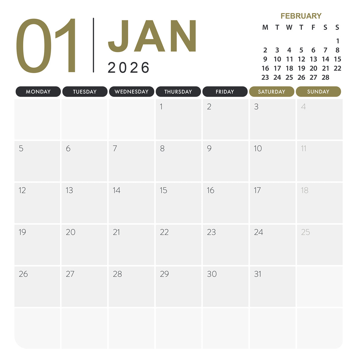 Desplegado, el calendario mide unos 30 x 42 cm, con la imagen en la parte superior y debajo todas las fechas del mes claramente expuestas. Este calendario empieza el lunes, para que siempre estés bien preparado para la semana que tienes por delante.