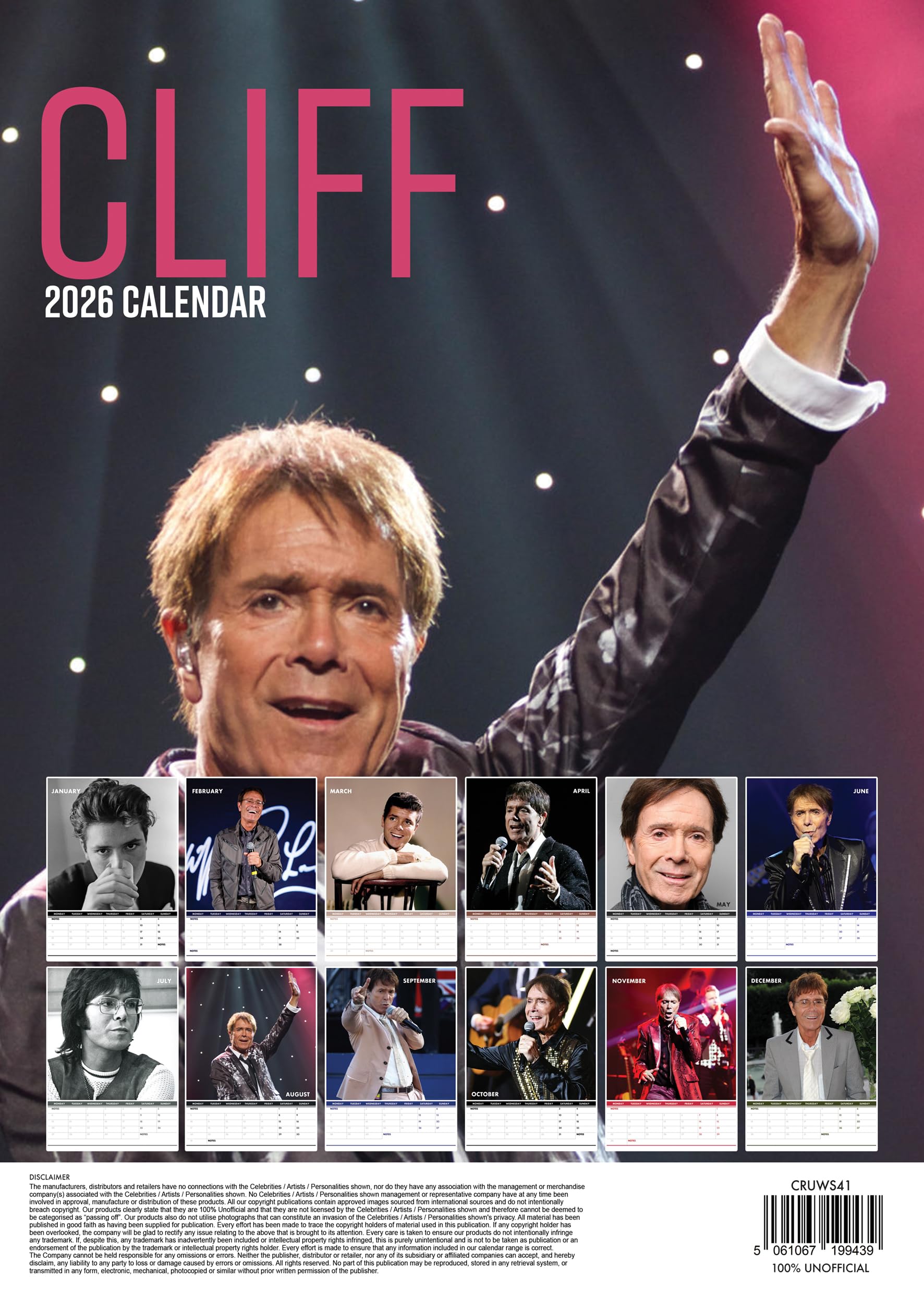 El calendario A3 de Cliff Richard para 2026 contiene un total de 12 imágenes diferentes a todo color, cada mes una nueva y asombrosa foto de esta celebridad. Imprescindible para los verdaderos amantes de Cliff Richard