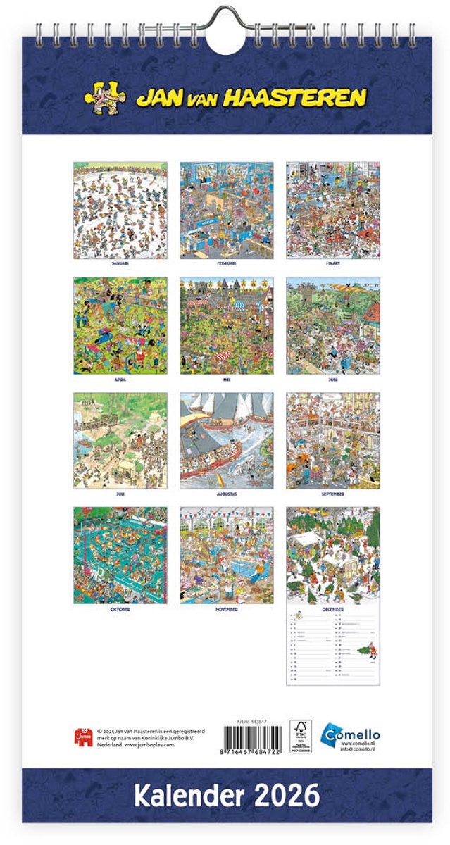 Si eres un verdadero fan de Jan van Haasteren, ¡sabrás que sus dibujos están llenos de detalles divertidos y ocultos! Cada mes, este calendario te invita a descubrir los rasgos conocidos y las bromas ocultas en el gran plato: