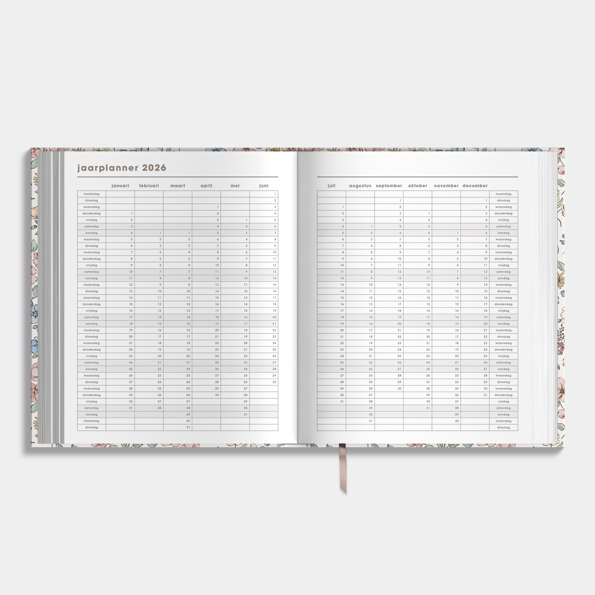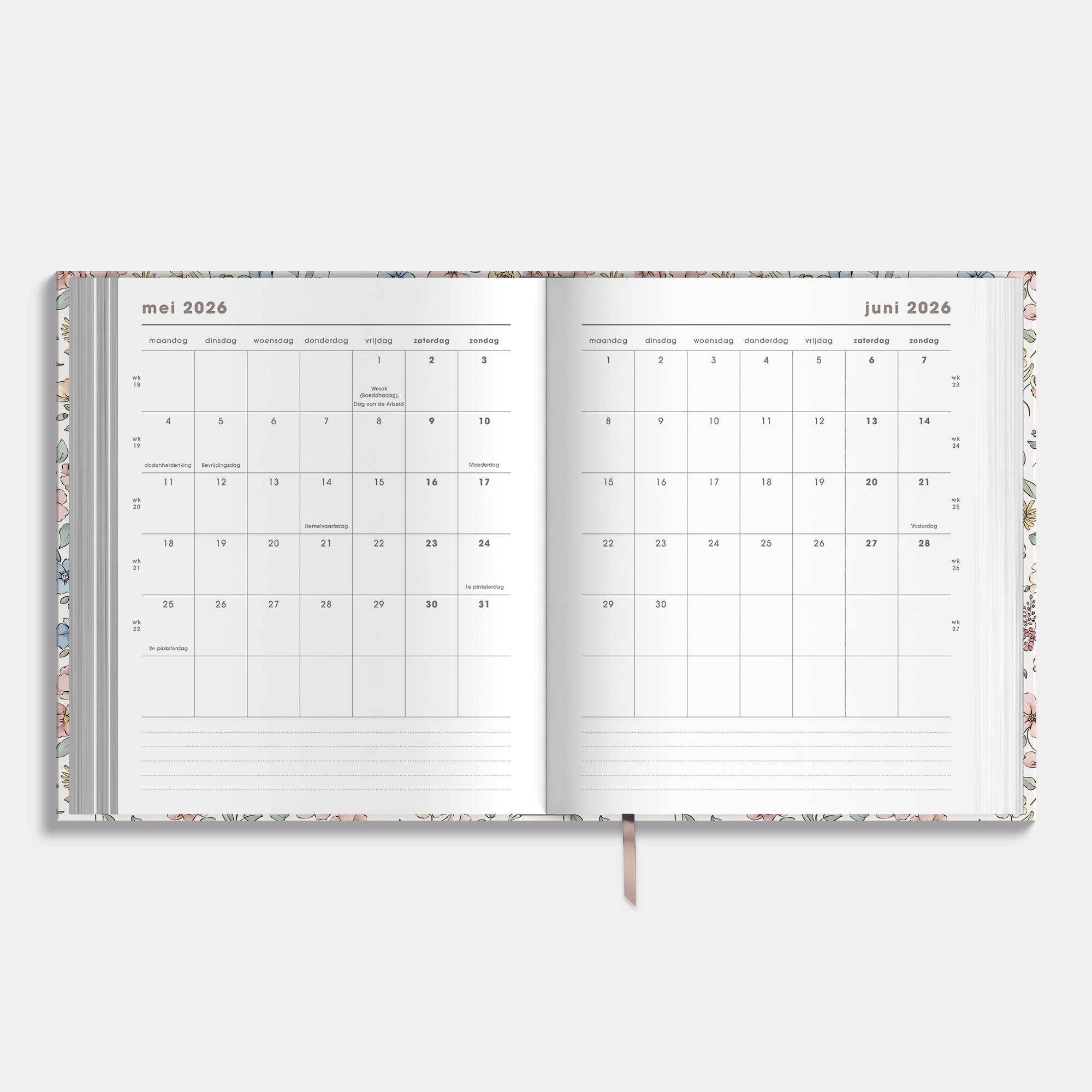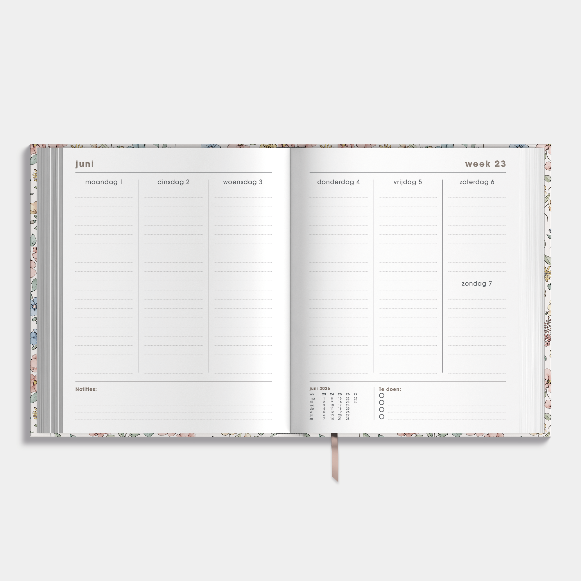Wat deze planner 2026-2027 bijzonder maakt is het fijne bloemenpatroon. De kleine getekende bloemen zorgen voor een rustige en vriendelijke uitstraling. Deze agenda is perfect voor iedereen die houdt van een lichte en elegante planner.