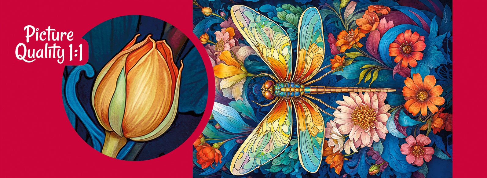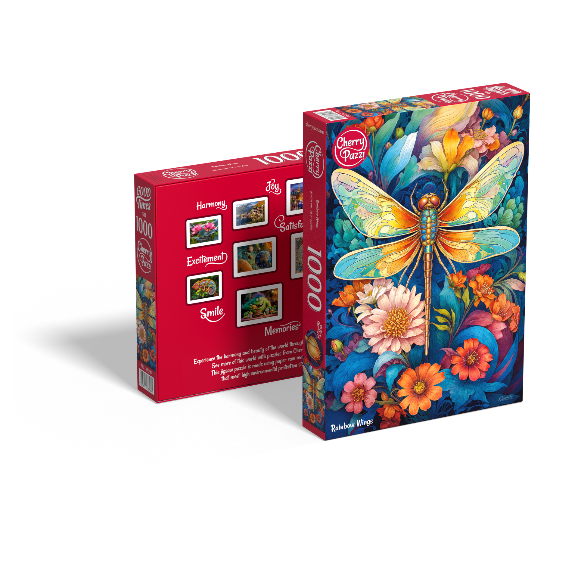 Ontdek de magie van de natuur met de Rainbow Wings Puzzel 1000 Stukjes. Een fonkelende libel met zachte regenboogvleugels zweeft tussen kleurrijke bloemen en straalt rust, licht en harmonie uit. Beleef de betovering van kleur, natuur en evenwicht terwijl je stukje voor stukje deze schitterende scène tot leven brengt. Breng schoonheid en sereniteit in huis met deze sprankelende puzzel vol natuurlijke pracht.