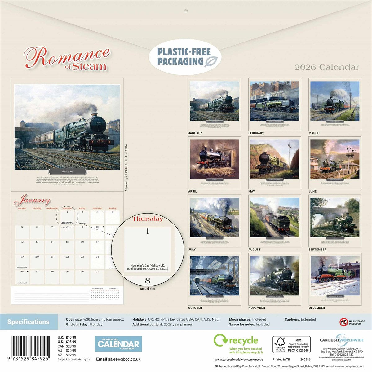 Este precioso Calendario Carrusel Romance de los Trenes de Vapor 2026 está hecho de papel satinado y comienza en enero de 2026 y tiene una gran y hermosa imagen del Romance de los Trenes de Vapor hasta diciembre de 2026 con las fechas disponibles del mes debajo con mucho espacio para notas personales y cumpleaños. Ya se han añadido al calendario algunos días festivos importantes. Los textos del calendario de 12 meses Carrusel Romance of Steam están impresos en inglés. Desplegado, el calendario mide aprox. 30 x 60 cm, con la imagen en la parte superior y las fechas del mes debajo.