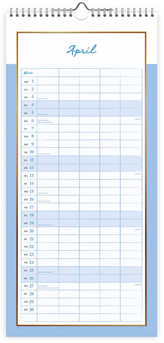 Avec suffisamment d'espace pour accueillir jusqu'à 5 personnes et une mise en page mensuelle claire, ce calendrier t'aide à rester organisé tout au long de l'année. De plus, il inclut tous les jours fériés et les vacances aux Pays-Bas et en Belgique, pour que tu sois toujours à la page.