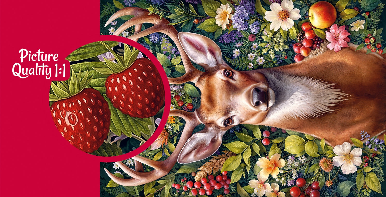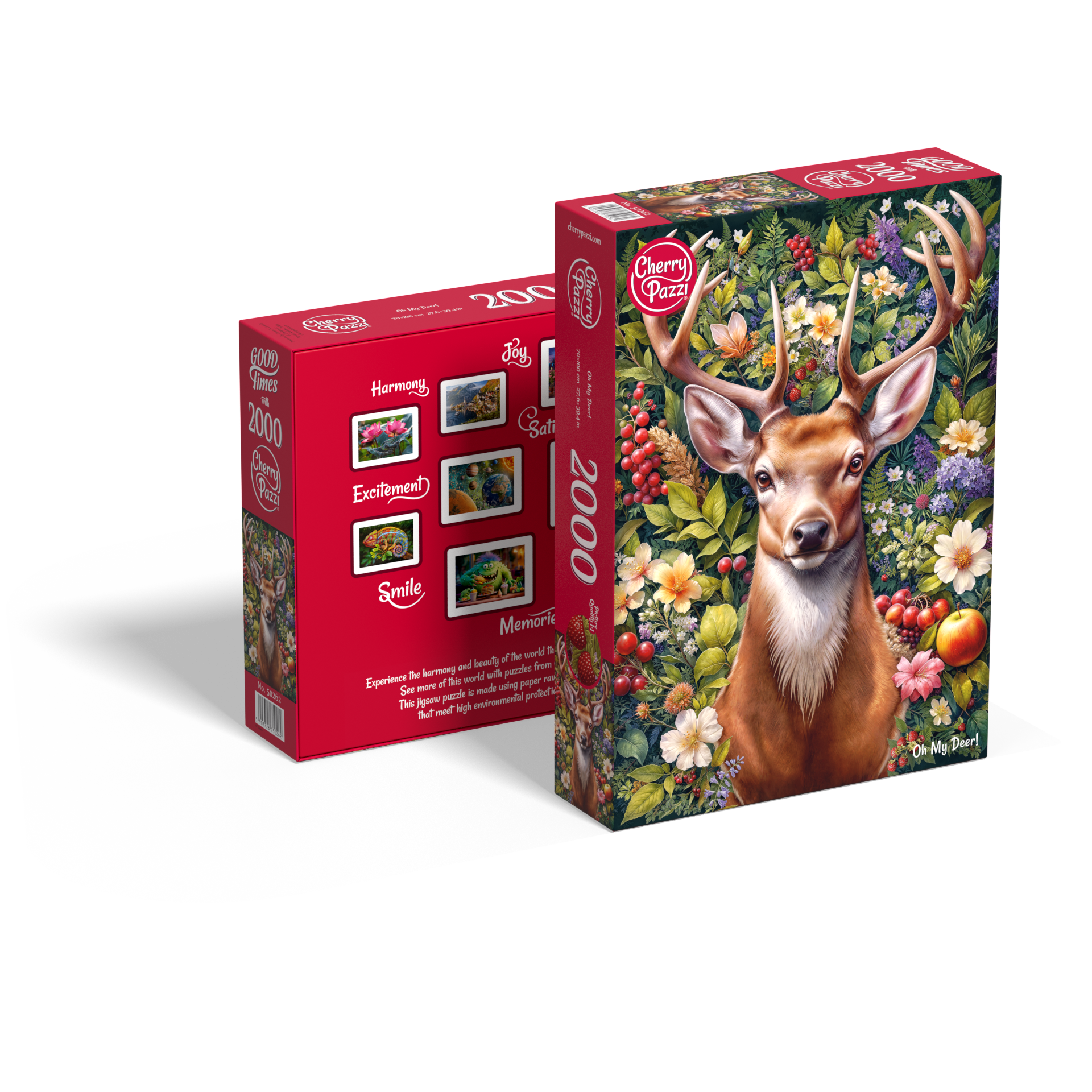 Ontdek een prachtige afbeelding waar wildernis en flora samensmelten. De Oh My Deer! Puzzel 2000 Stukjes toont een edelhert met vorstelijke geweien, omkranst door weelderig groen en levendige bloemen. Beleef een krachtige én serene compositie: smaragdgroen bladerdek omlijst de zachte, expressieve ogen, terwijl bloembladen als juwelen oplichten. Breng een harmonie van natuur en kleur in huis en geniet van elk detail.
