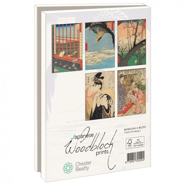 Japanse houtdrukken, ook wel ukiyo-e, staan bekend om hun heldere kleuren, verfijnde composities en verhalende kracht. Ze verbeelden vaak landschappen, seizoenen en scènes uit het dagelijks leven. De prenten in dit kaartenmapje zijn afkomstig uit de collectie van de Chester Beatty Library en brengen de rust en schoonheid van deze kunstvorm samen in een elegante kaartenset.