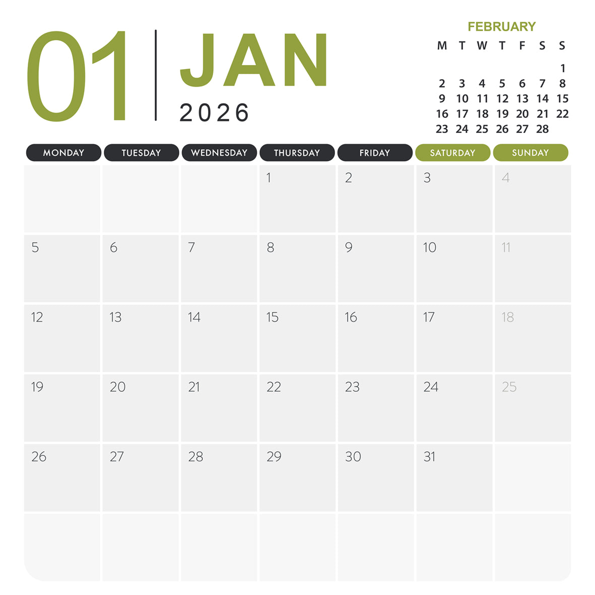 - 🇬🇧 Bovendien: Engelstalig kalendarium – met duidelijke maandnamen en weekstart op maandag