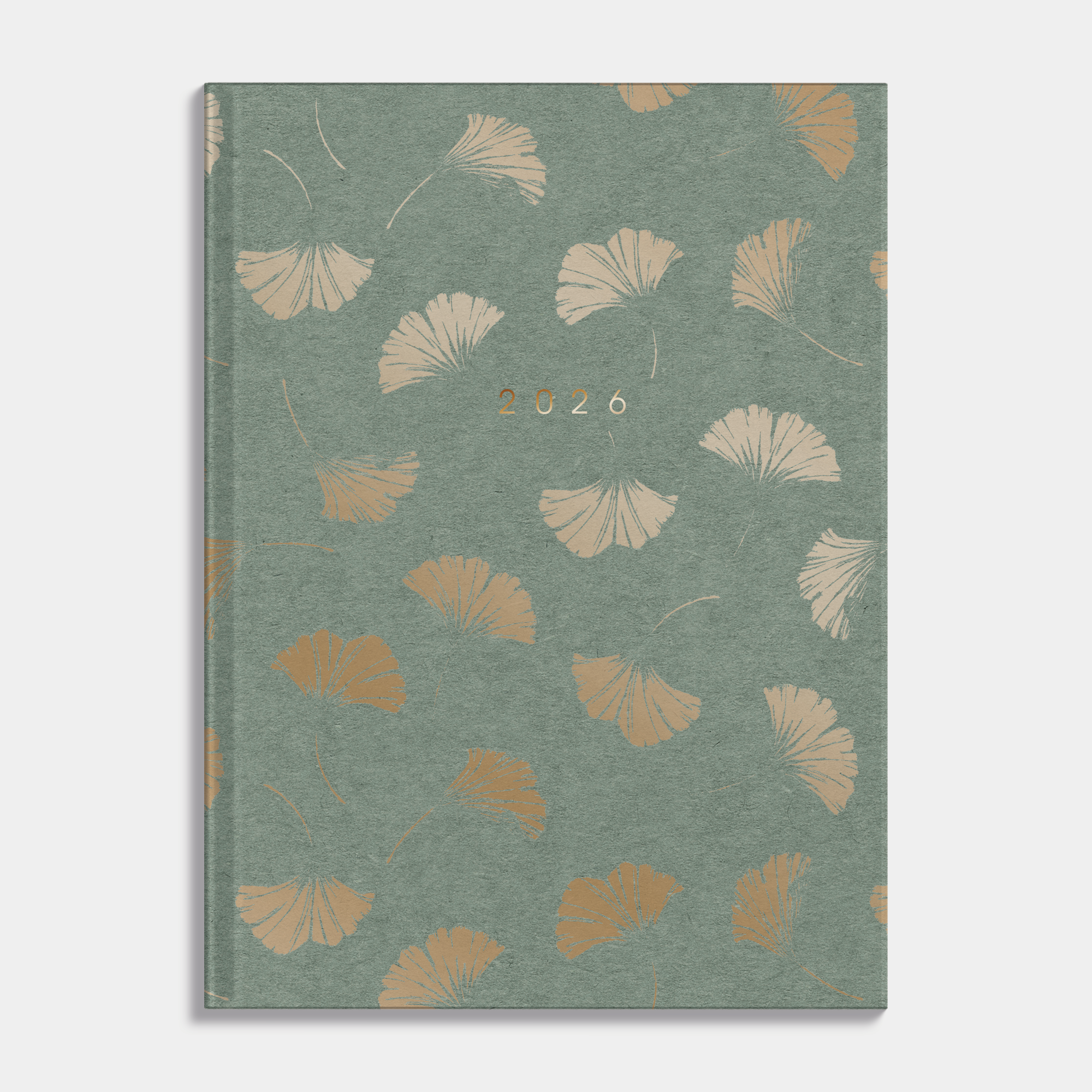 Piccola agenda compatta con copertina rigida che presenta un motivo di foglie di ginkgo in lamina d'oro su uno sfondo color verde acqua. L'agenda ha un design tranquillo ed è dotata di un nastro di lettura. Il layout dell'agenda prevede una settimana su due pagine. L'agenda va da novembre 2025 a dicembre 2026.