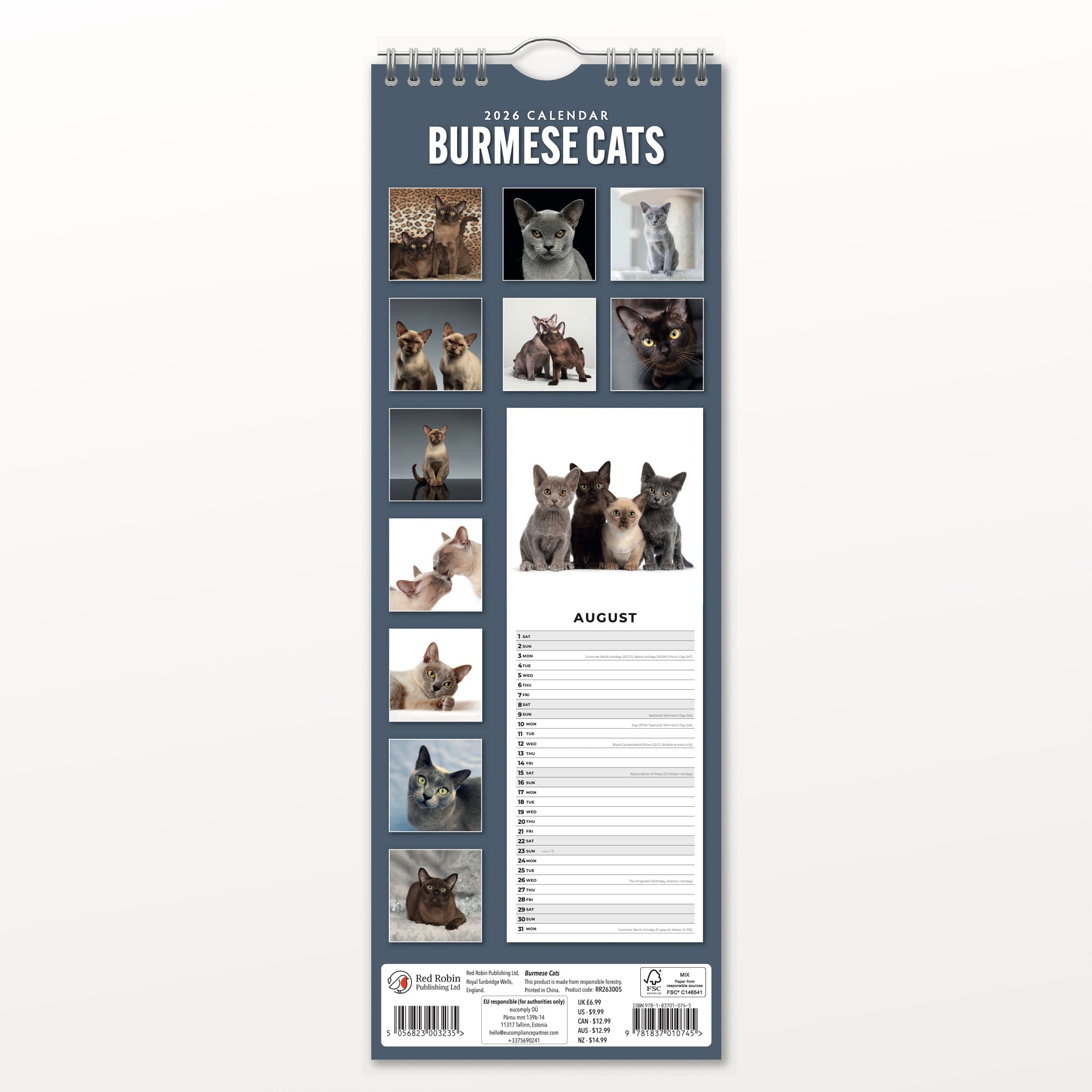 Ben jij gecharmeerd van het elegante en aanhankelijke karakter van de Burmees? Dan is de Burmees Slimline Kalender 2026 van Red Robin een prachtige aanwinst voor jouw muur. Met andere woorden: elke maand een stijlvolle blik op deze bijzondere kat, verpakt in een compact en modern design.