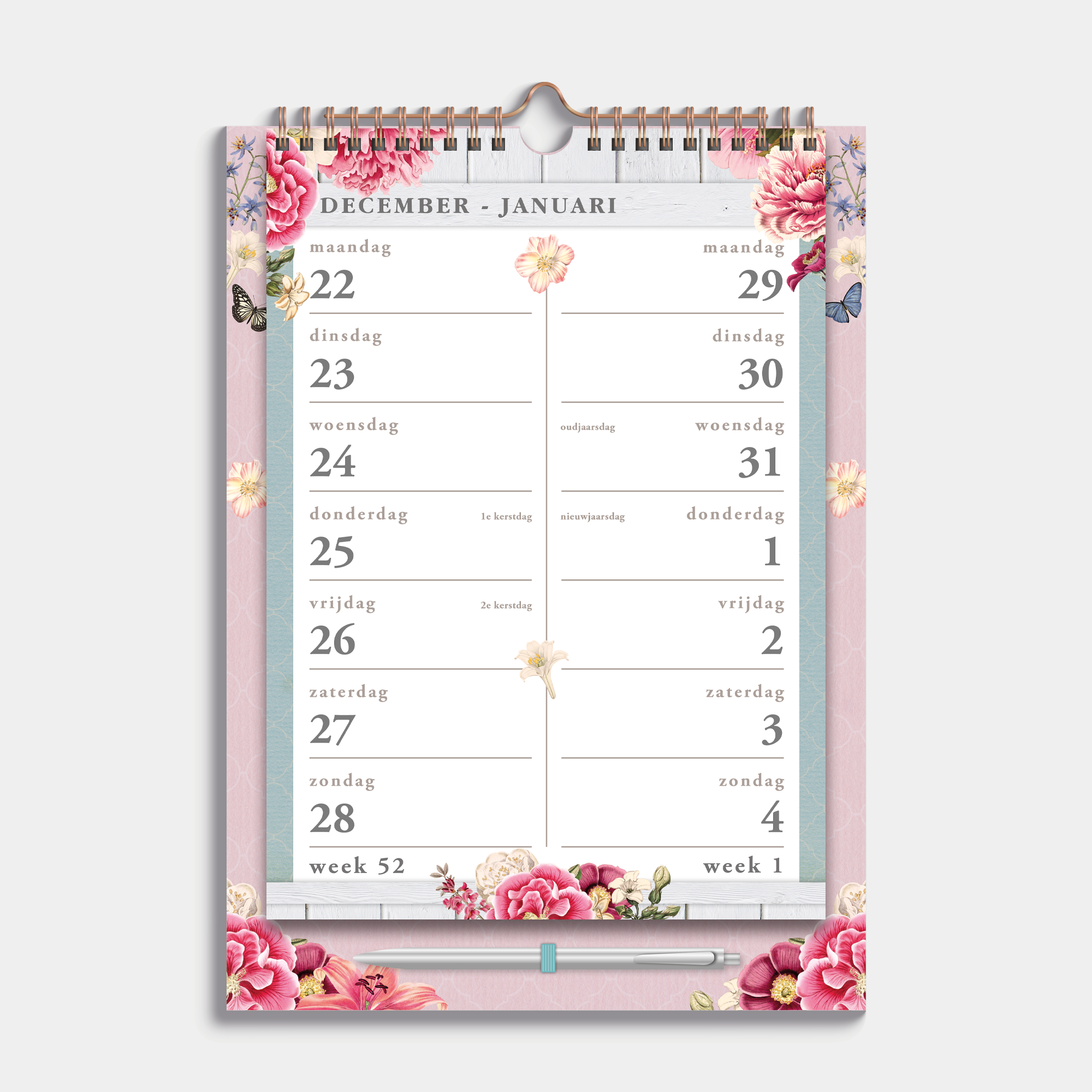 Fine calendario a spirale A4 su cartoncino con penna. Due settimane su un foglio, disposte in modo ordinato. Comodo per pianificare il futuro! In tema brocante, con spirale e appendino in rame. Questo calendario a spirale va da novembre 2025 a dicembre 2026