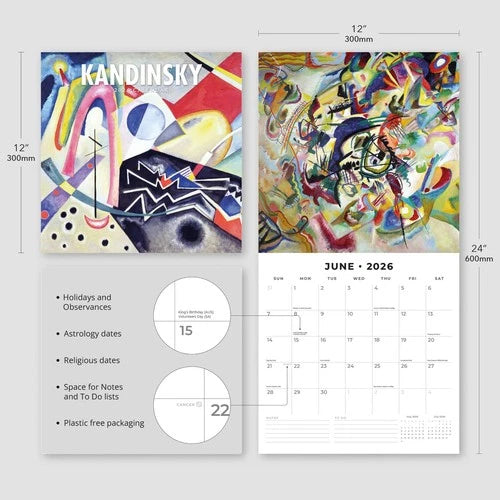 Il Calendario Kandinsky 2026 contiene 13 riproduzioni a colori di 30 x 30 cm che riflettono lo sviluppo del suo stile: dai paesaggi espressivi alle composizioni geometriche. Considera:
