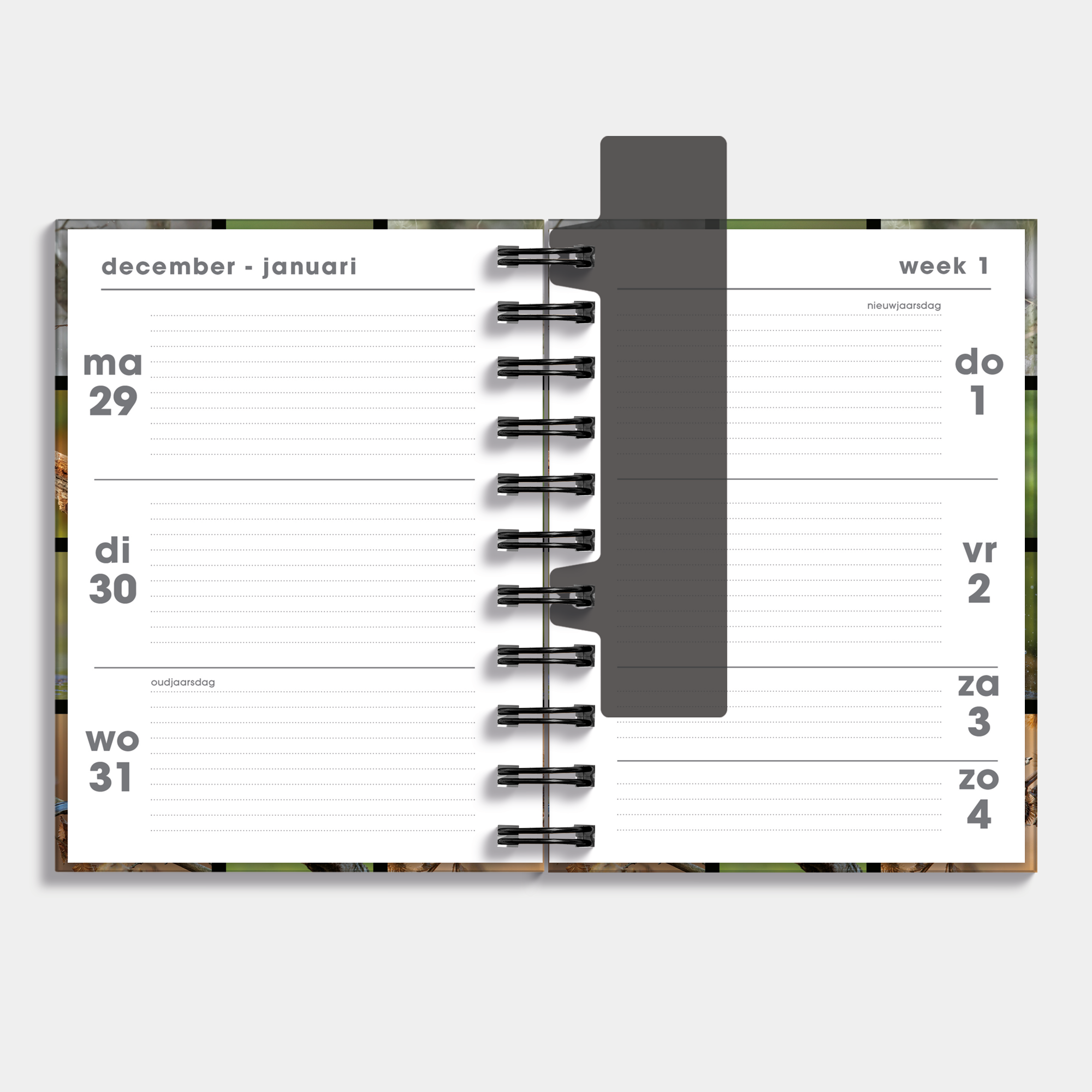 Een stijlvolle planner met spiraalbinding, harde cover en foto’s van vogels die in Nederland voorkomen.