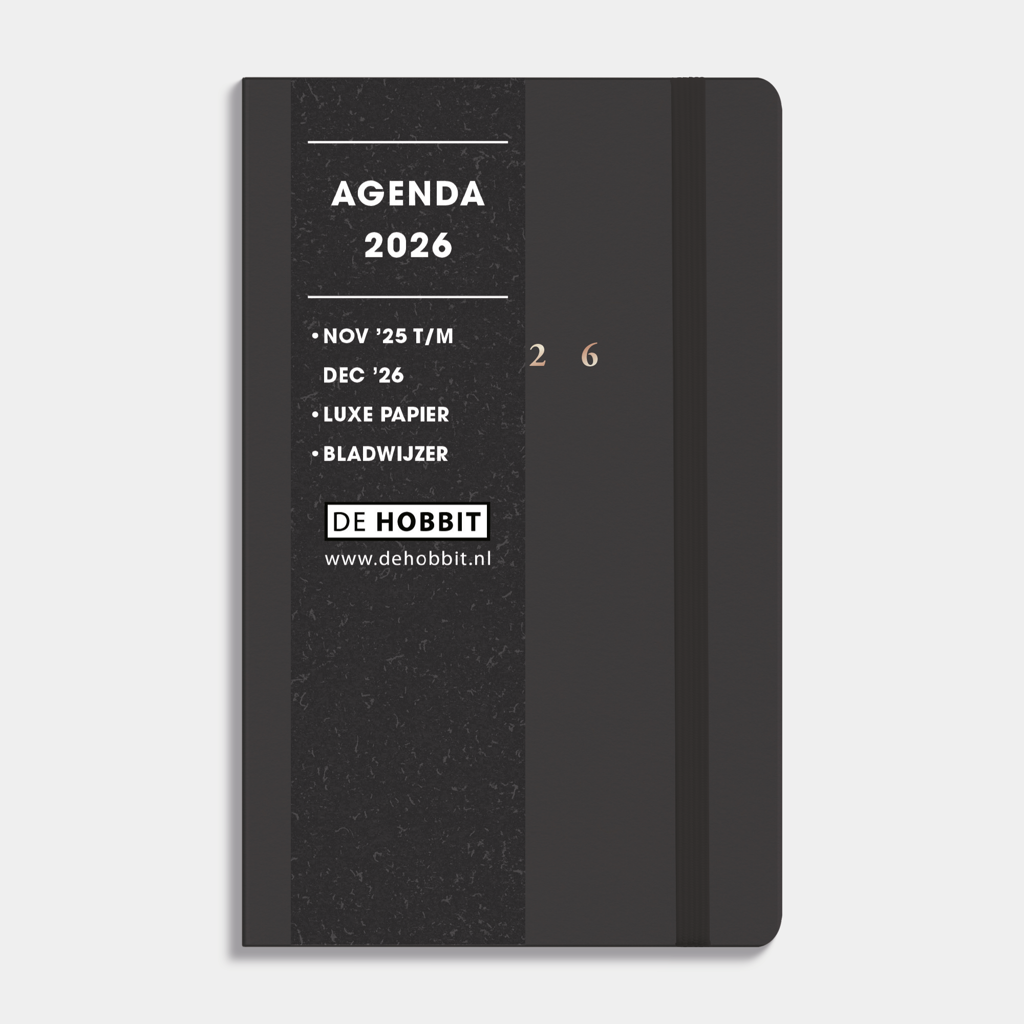 Deze compacte luxe A6 agenda 2026 straalt klasse uit dankzij de harde cover in antraciet suèdelook met afgeronde hoeken. Het jaartal 2026 is stijlvol aangebracht in glanzende goudfolie, terwijl het prachtige crèmekleurige papier zorgt voor een warme en luxueuze uitstraling.