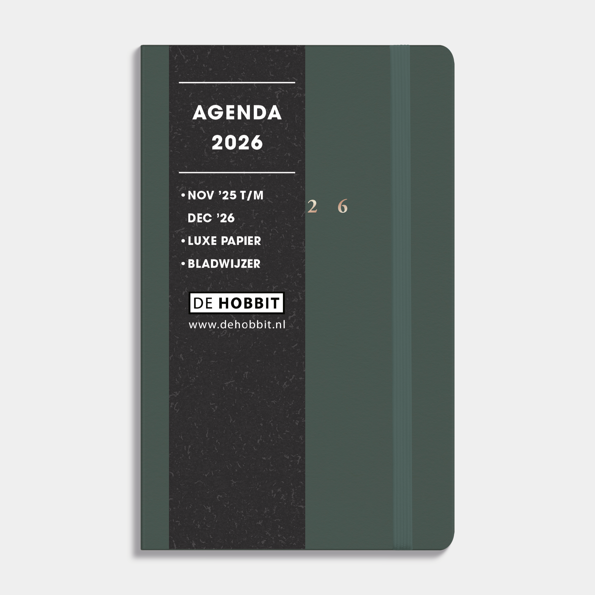 Deze compacte luxe A6 agenda 2026 straalt klasse uit dankzij de harde cover in donkergroen suèdelook met afgeronde hoeken. Het jaartal 2026 is stijlvol aangebracht in glanzende goudfolie, terwijl het prachtige crèmekleurige papier zorgt voor een warme en luxueuze uitstraling.