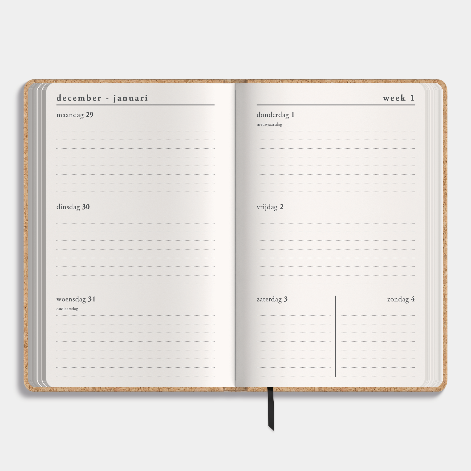 Een elegante zakagenda met weekoverzicht, harde cover in kurk suèdelook en luxe goudfoliedruk.