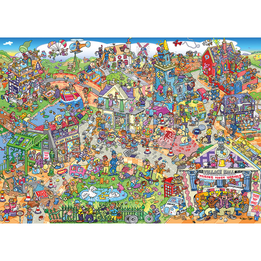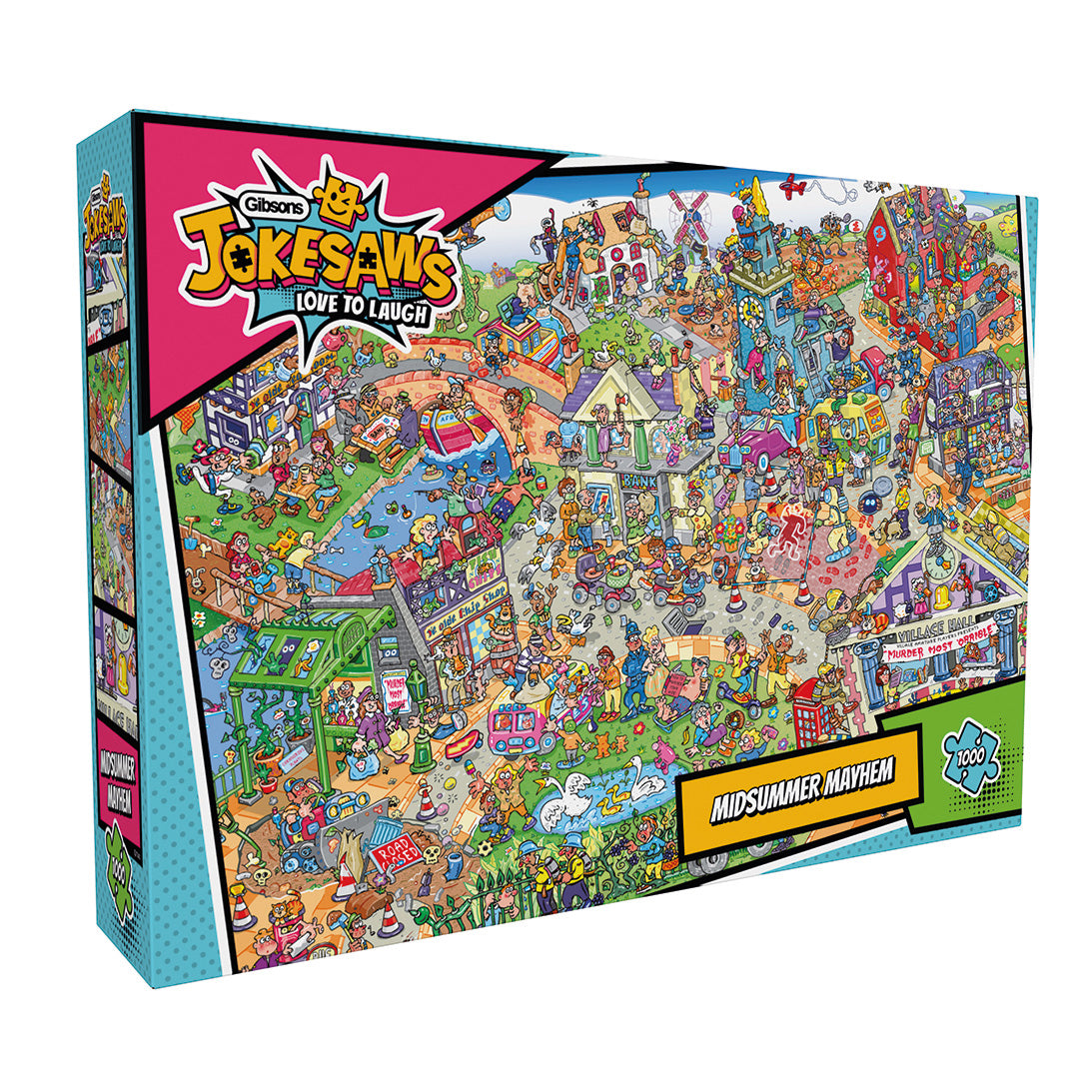 Pak je vergrootglas en bereid je voor op complete Jokesaw-chaos. Deze Gibsons legpuzzel toont een levendig midzomerdorp waar allerlei streken worden uitgehaald. Niet alleen zie je inwoners elkaar voor de gek houden, maar bovendien vinden er bankovervallen, vreemde taferelen en bizarre situaties plaats. Daarnaast is er te midden van alle chaos ook een vreselijke moord gepleegd. De grote vraag is: kun jij de schuldige ontdekken, die zich in het volle zicht verborgen houdt, of raak je juist afgeleid door alle grappen en visuele afleidingen? De illustratie is geschilderd door Phil Dobson, een getalenteerde kunstenaar die bekendstaat om zijn kleurrijke, drukke en humoristische scènes vol verborgen grapjes. Hierdoor blijft het beeld continu verrassen en zorgt elk puzzelmoment voor nieuwe ontdekkingen.