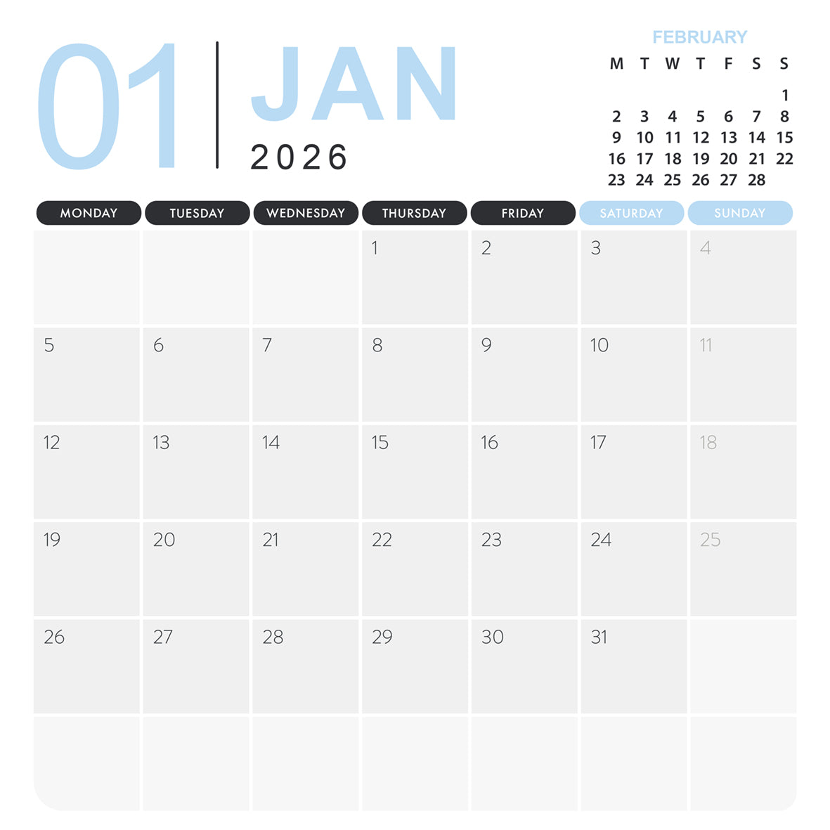• Calendarium: Maand-tot-maand overzicht met werkrooster, volledig in het Engels