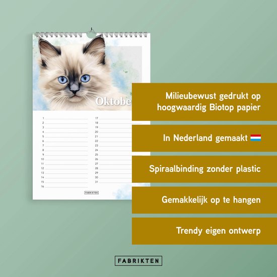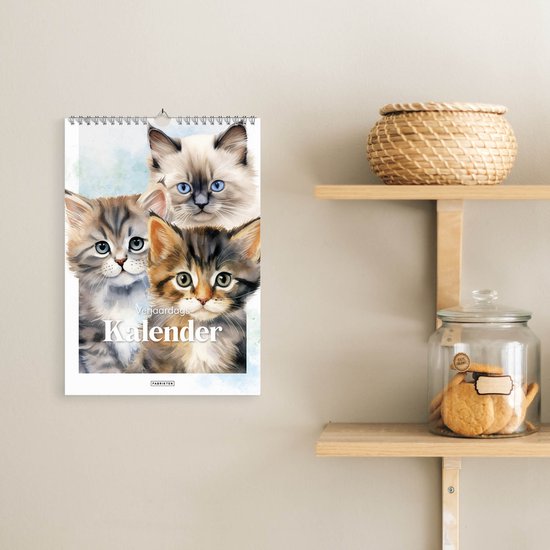 Deze verjaardagskalender is met zorg in Nederland ontworpen en geproduceerd op 300 grams duurzaam Biotop papier. De charmante kattenillustraties, gecombineerd met een metaalkleurige spiraalbinding en een praktisch ophangoog, geven de kalender een vrolijke en stijlvolle uitstraling aan de muur.