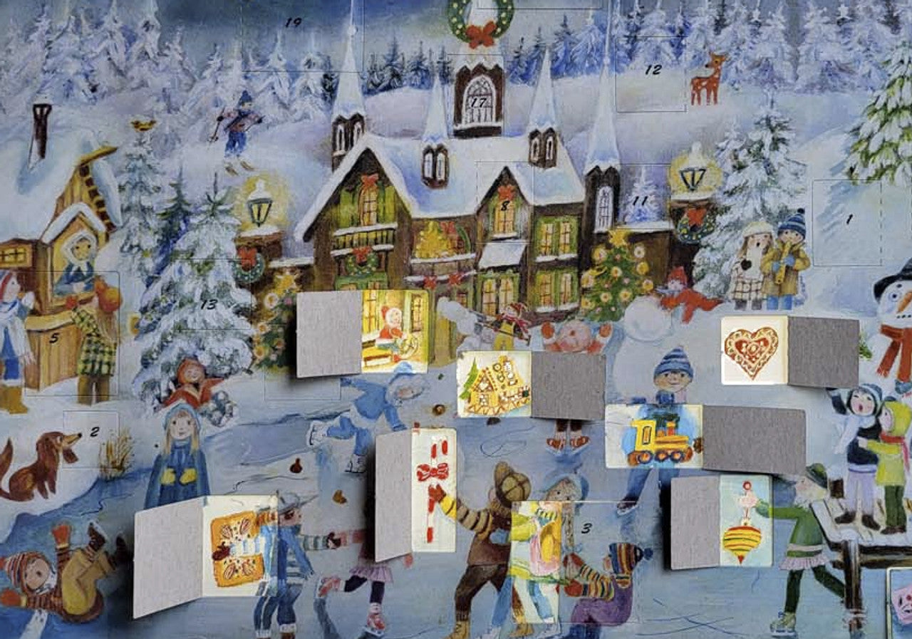 Een aantrekkelijke adventskalender in alpine stijl combineert Victoriaanse elementen. De afbeeldingen aan de achterkant lichten op als je de kalender voor een lichtbron hangt en daarbij mag mica natuurlijk niet ontbreken!