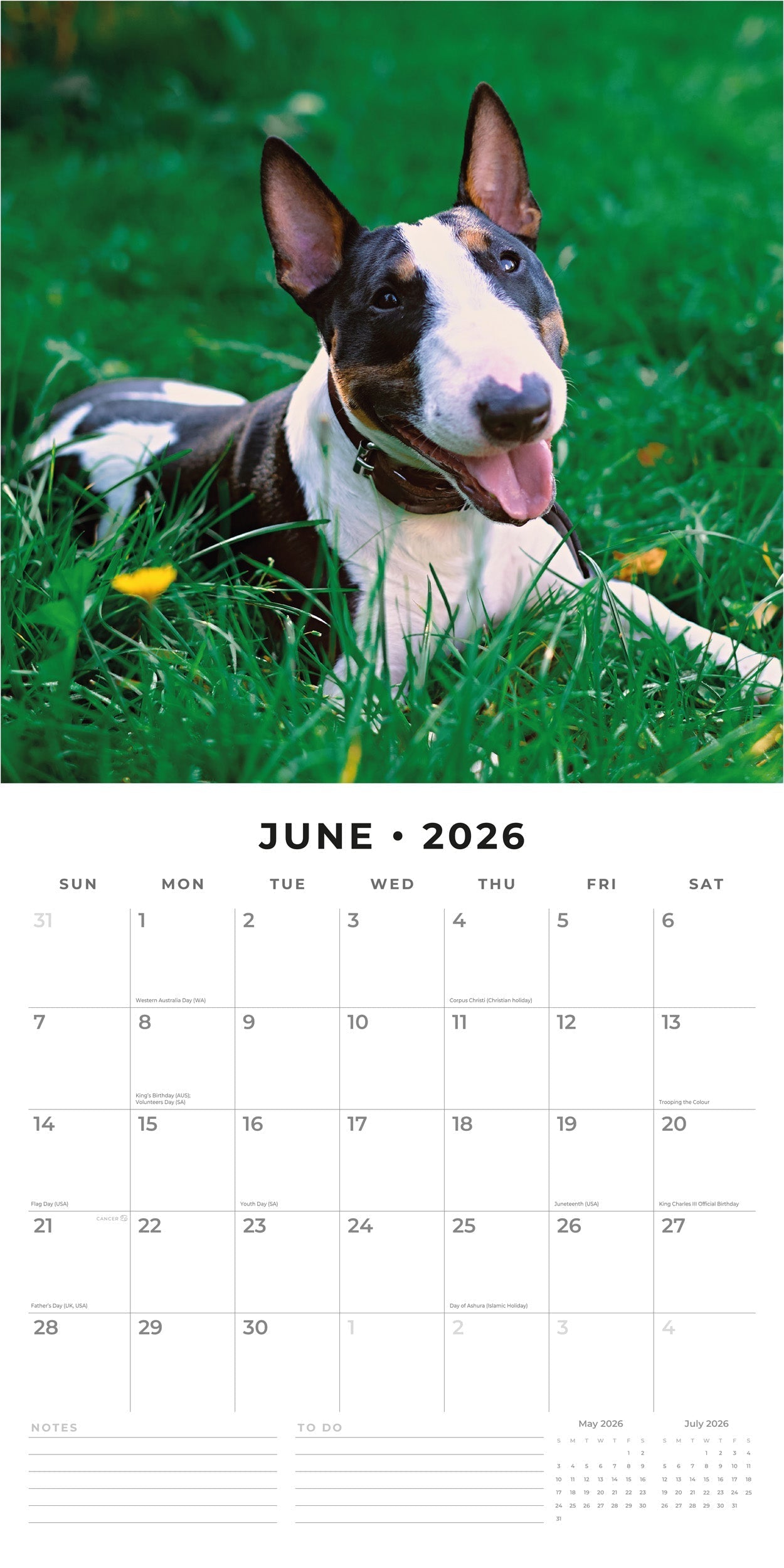 De Bull Terrier Kalender 2026 is een opvallende wandkalender van 30 x 30 cm, met maand na maand schitterende foto's van deze unieke, loyale en ondeugende viervoeters. Met andere woorden: elke pagina brengt een glimlach met z’n sprekende ogen, gespierde bouw en kenmerkende eivormige snuit.