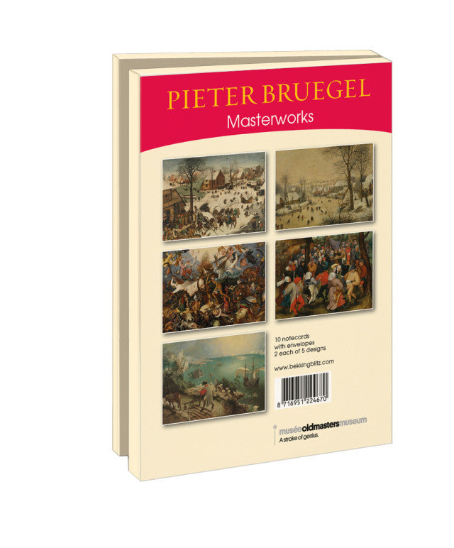 Pieter Bruegel (de Oude) was een invloedrijke Vlaamse schilder uit de 16e eeuw, bekend om zijn levendige taferelen, landschappen en alledaagse scènes. Zijn werk zit vol verhalende details en symboliek en nodigt uit om steeds opnieuw ontdekt te worden. De kaarten in dit mapje brengen zijn meesterwerken samen in een compacte en stijlvolle vorm.