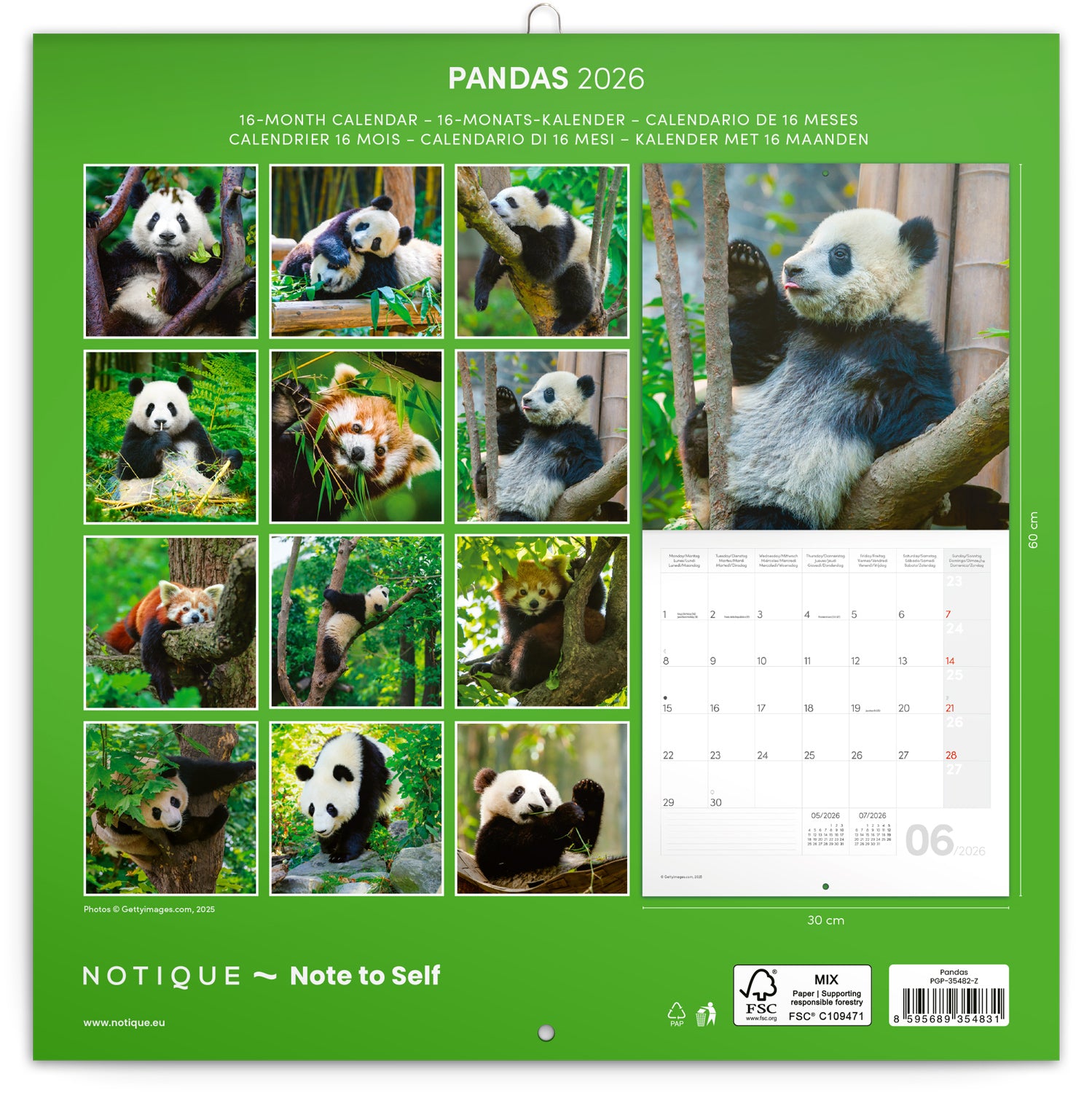 Panda’s zijn een wereldwijd symbool van rust, vriendelijkheid en tederheid. Daarbij komt: hun expressieve kopjes en speelse gedrag maken elke foto tot een mini-verhaal. Bovendien: met een helder maandraster, ruimte voor notities en overzicht van feestdagen en maanfasen is deze kalender niet alleen mooi, maar ook buitengewoon praktisch.