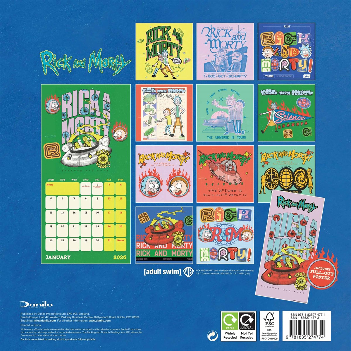 Deze prachtige Rick and Morty Kalender 2027 Danilo is gemaakt van glanspapier en start in januari 2027 en heeft t/m december 2027 een grote mooie foto van de Rick and Morty met daaronder de beschikbare data van de maand met voldoende ruimte voor persoonlijke notities en verjaardagen. Een aantal belangrijke feestdagen zijn alvast toegevoegd op de kalender. De teksten op de Rick and Morty 12 maanden kalender Danilo zijn bedrukt in het Engels. Uitgeklapt is de kalender ca. 30 x 60 cm met bovenaan de afbeelding en daaronder de alle data van de maand.