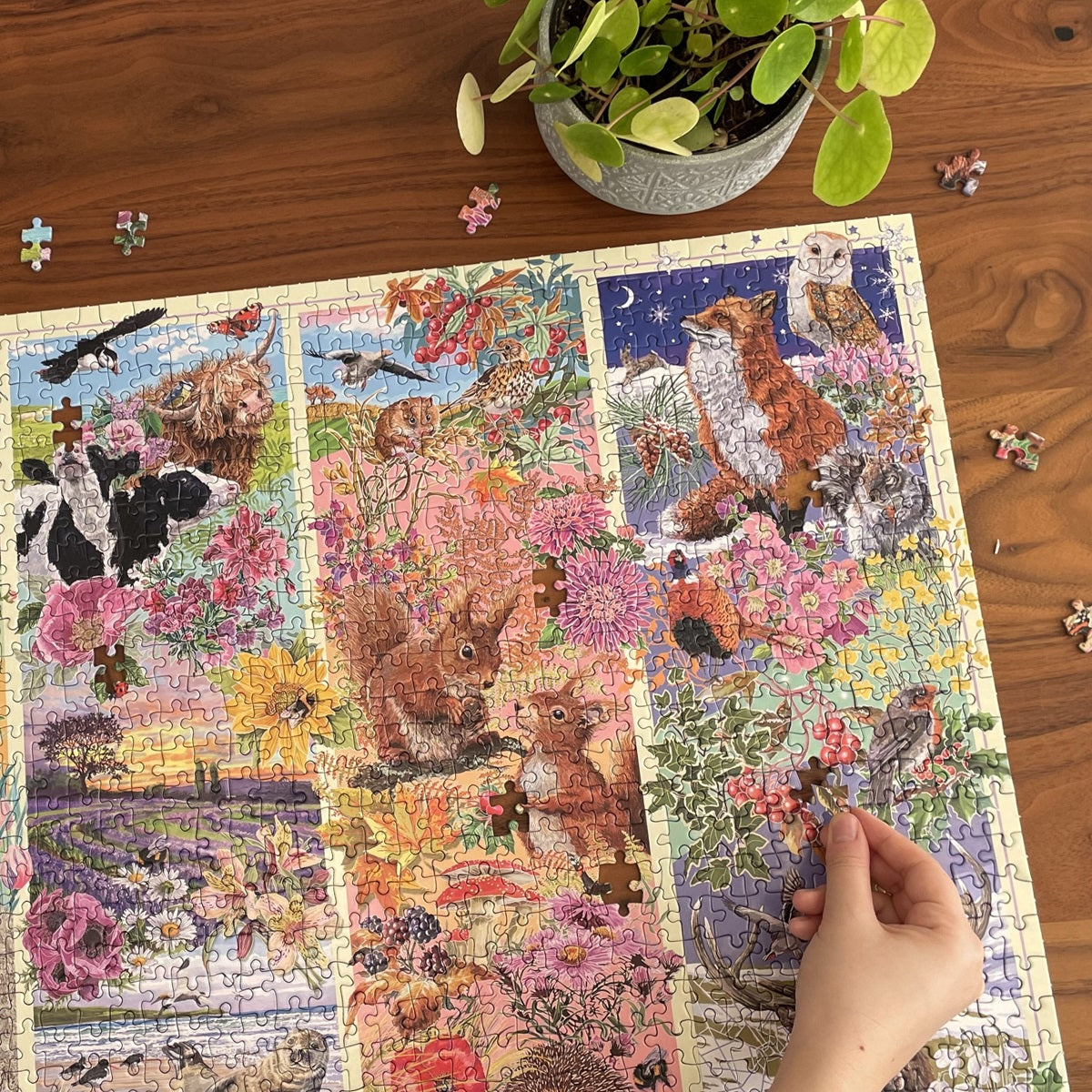 Deze Gibsons legpuzzel laat een levendig tafereel zien waarin lente, zomer, herfst en winter harmonieus samenkomen. Elk seizoen heeft zijn eigen kleuren, activiteiten en kleine verhalen. Het ontwerp is gemaakt door illustrator Janice Daughters, bekend om haar nostalgische, verhalende stijl en oog voor detail. Tijdens het puzzelen ontdek je steeds nieuwe scènes en subtiele veranderingen die de seizoenen zo herkenbaar maken.